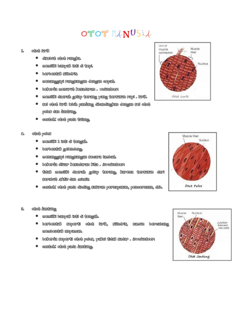 Cari tahu tentang fungsi otot polos, otot jantung, dan otot lurik serta contoh dan letaknya di tubuh, yuk! Berbentuk panjang dan memiliki banyak inti sel (multinuklei). Otot yang ujung atasnya mempunyai dua tendon disebut otot.